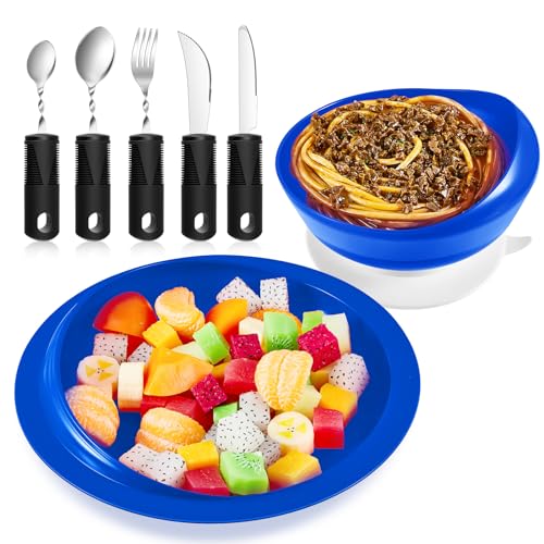 Innovative Design: the adaptive dinnerware’s high to low design helps hold food, providing more keep an eye on when you eat; The suction cup on the base fixes the bowl and plate on the table, making you more at ease; The bendable cutlery set is flexible, and the angle can be adjusted according to your personal preferences; The large and heavy handle provides stability and keep an eye on throughout eating
