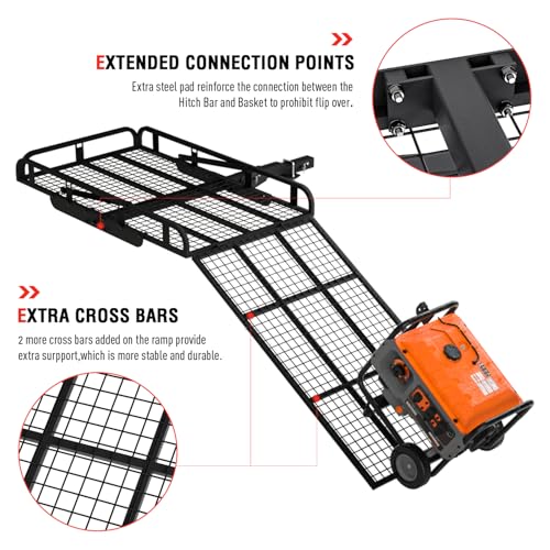 Hitch Mount Steel Cargo Carrier Basket with 49” Folding Wheelchair Ramp, Fits 2” Trailer Mounted Hitches