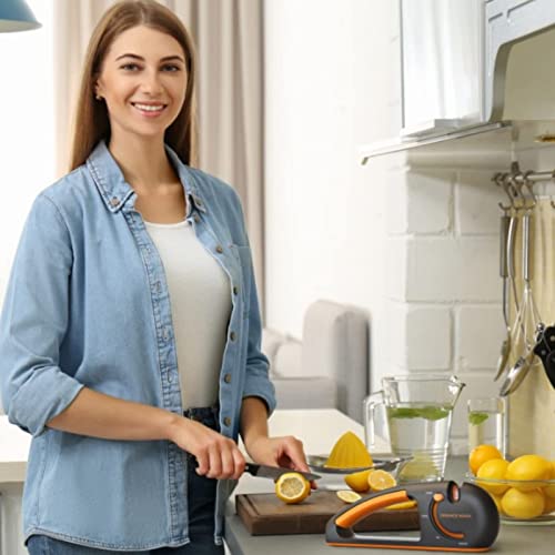 🔪Razor Sharp Edge: Orange Ninja kitchen knife sharpener, can quickly and easily sharpen a wide variety of knives. Knife Sharpening is done in three steps (coarse, medium, fine) for knives. All it takes is a few simple strokes to keep your kitchen knives razor-sharp.