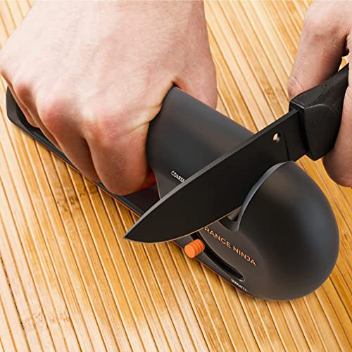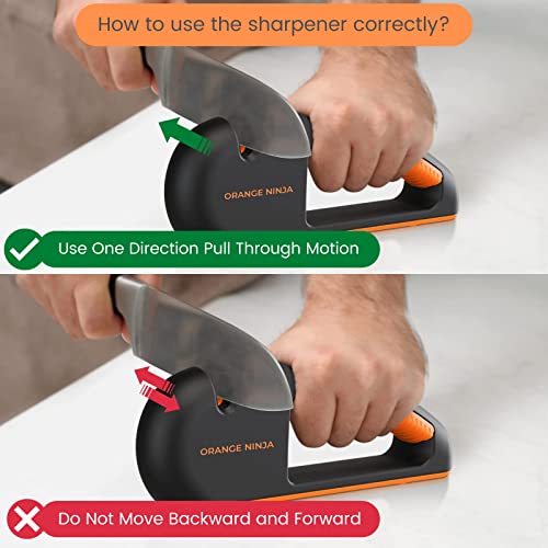 🔪Razor Sharp Edge: Orange Ninja kitchen knife sharpener, can quickly and easily sharpen all kinds of knives. Knife Sharpening is done in three steps (coarse, medium, fine) for knives. All it takes is a couple of simple strokes to keep your kitchen knives razor-sharp.