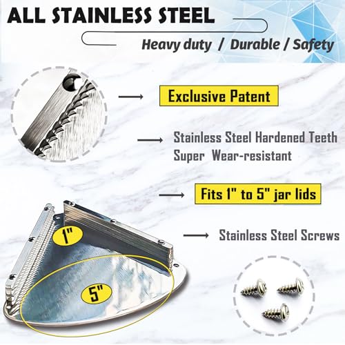 Upgraded Stainless Steel Jar Opener — Our Jar Opener made of all stainless steel, the stainless steel teeth are hardened, super wear-resistant and never rust. Stronger and more durable than plastic jar opener, simpler and longer life than electronic automatic can opener, no batteries, no worries about plastic arms breaking and electronic failures.
